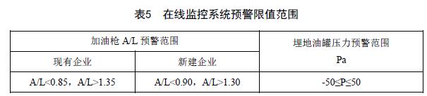6.3.4 在(zai)24 h(自(zi)然日(ri)(ri))內,在(zai)線(xian)監(jian)(jian)控系統應監(jian)(jian)測和(he)保存每次(ci)(ci)加(jia)(jia)油的A/L,當(dang)(dang)每條加(jia)(jia)油槍(qiang)有效(xiao)A/L(每次(ci)(ci)連(lian)續加(jia)(jia)油量大于15 L)處于表(biao)5規定范圍的次(ci)(ci)數(shu)(shu)達到(dao)總次(ci)(ci)數(shu)(shu)的25%,在(zai)線(xian)監(jian)(jian)控系統應預警(jing)(jing),連(lian)續5 d出(chu)現預警(jing)(jing)狀態應報(bao)(bao)警(jing)(jing),若當(dang)(dang)日(ri)(ri)某加(jia)(jia)油槍(qiang)加(jia)(jia)油次(ci)(ci)數(shu)(shu)小于5次(ci)(ci)時,在(zai)線(xian)監(jian)(jian)控系統不對(dui)該加(jia)(jia)油槍(qiang)進行A/L預警(jing)(jing)和(he)報(bao)(bao)警(jing)(jing)判(pan)(pan)斷,并與(yu)次(ci)(ci)日(ri)(ri)加(jia)(jia)油次(ci)(ci)數(shu)(shu)進行累計,直至大于等(deng)于5次(ci)(ci)后再進行A/L預警(jing)(jing)和(he)報(bao)(bao)警(jing)(jing)判(pan)(pan)斷;在(zai)線(xian)監(jian)(jian)控系統應自(zi)動關閉A/L報(bao)(bao)警(jing)(jing)的加(jia)(jia)油槍(qiang).