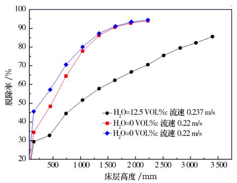 為(wei)了實現在最經(jing)濟的(de)(de)條件下去除(chu)(chu)高(gao)達99%的(de)(de)SO2和其(qi)他有害物質(zhi),并(bing)通過選擇性催化(hua)還原反應去除(chu)(chu)85%的(de)(de)NOx,通過先導試驗(yan)確定床層高(gao)度。活性炭床層高(gao)度對(dui)NOx脫(tuo)(tuo)除(chu)(chu)率(lv)以及脫(tuo)(tuo)除(chu)(chu)率(lv)增加(jia)量(liang)的(de)(de)影響分(fen)別如圖4(圖中H2O含量(liang)為(wei)其(qi)體(ti)積分(fen)數)和圖5所示。