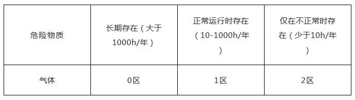 按場(chang)所中(zhong)危(wei)險物質(zhi)存在時間的長短,將兩類不同物態下的危(wei)險場(chang)所劃(hua)分為三(san)個區(qu)(qu)(qu),即:對(dui)爆炸性(xing)氣體(ti)環境(jing),為 0 區(qu)(qu)(qu)、 1 區(qu)(qu)(qu)和 2 區(qu)(qu)(qu);對(dui)可(ke)燃(ran)性(xing)粉塵(chen)環境(jing),為 20 區(qu)(qu)(qu)、 21 區(qu)(qu)(qu)和 22 區(qu)(qu)(qu)。