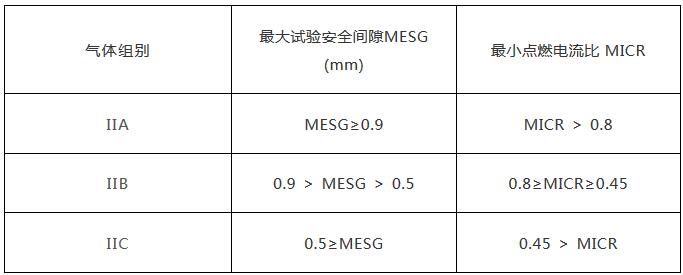 II 類隔爆型(xing)電氣設(she)備或(huo)(huo)本(ben)質安全型(xing)電氣設(she)備,按其適用于(yu)爆炸(zha)性氣體混合物的最大試(shi)驗安全間(jian)隙(xi)或(huo)(huo)最小點燃電流比,進一(yi)步分為 IIA 、 IIB 和 IIC 類。如下(xia)表所示。