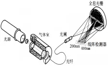 光(guang)(guang)源發(fa)出(chu)的(de)紫外光(guang)(guang)通(tong)過光(guang)(guang)纖(xian)傳(chuan)輸到測量(liang)室(shi),測量(liang)室(shi)樣氣(qi)在特(te)定波段吸(xi)收(shou)紫外光(guang)(guang)譜(pu)(pu)能量(liang),被吸(xi)收(shou)后的(de)光(guang)(guang)束(shu)通(tong)過光(guang)(guang)纖(xian)傳(chuan)輸到光(guang)(guang)譜(pu)(pu)儀,在光(guang)(guang)譜(pu)(pu)儀內(nei)部經過光(guang)(guang)柵分光(guang)(guang),由二極管(guan)陣列檢測器將(jiang)分光(guang)(guang)后的(de)光(guang)(guang)信(xin)(xin)號轉換為(wei)電信(xin)(xin)號,獲得(de)氣(qi)體的(de)連續(xu)吸(xi)收(shou)光(guang)(guang)譜(pu)(pu)信(xin)(xin)息,最(zui)后根據特(te)定算法計(ji)算待測氣(qi)體濃(nong)度。其(qi)結構示(shi)意圖如下: