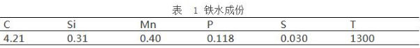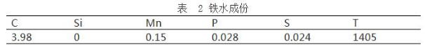 前期渣中加入石灰3 噸,輕(qing)燒 3 噸,冷料(liao) 3.5 噸,在吹煉(lian)到 1800 氧后起槍(qiang)倒渣,此時的(de)轉爐(lu)內鐵水溫度(du)(du)為 1405 度(du)(du),成份如(ru)下表(biao):