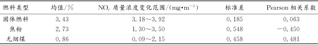因(yin)此(ci),在探討固(gu)(gu)體燃料(liao)(liao)類(lei)型對(dui)NOx排(pai)放(fang)的(de)影(ying)響(xiang)規(gui)(gui)律時,將(jiang)固(gu)(gu)體燃料(liao)(liao)比(bi)例(li)固(gu)(gu)定(ding),研究焦粉和無(wu)煙煤(mei)的(de)比(bi)例(li)變化對(dui)煙氣NOx排(pai)放(fang)的(de)影(ying)響(xiang)規(gui)(gui)律。根據固(gu)(gu)體燃料(liao)(liao)比(bi)例(li)樣本(ben)(ben)數據的(de)分(fen)布(bu)規(gui)(gui)律,選取具有(you)代(dai)表性的(de)固(gu)(gu)體燃料(liao)(liao)比(bi)例(li)為3.3%~3.5%的(de)樣本(ben)(ben)數據進(jin)行(xing)相關(guan)性分(fen)析研究,結果見表3。