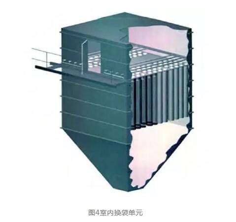 2005年,結合(he)琉璃河水(shui)泥(ni)廠(chang)窯尾(wei)電除(chu)塵器改造,我們(men)開(kai)始推出凈氣室室內換袋結構的袋除(chu)塵器(圖4),大大降(jiang)低了整機漏(lou)風率。