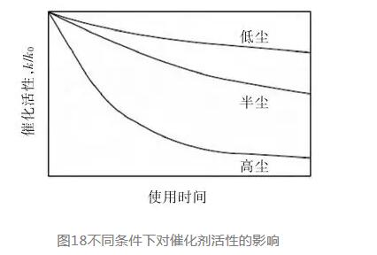 國外有關(guan)研究實驗結果給出了(le)催(cui)化(hua)劑(ji)活性使用壽(shou)命與氣體(ti)(ti)含(han)塵(chen)(chen)量的(de)關(guan)系(見圖18)。由此可見,氣體(ti)(ti)含(han)塵(chen)(chen)量高會大大縮短水泥SCR脫硝催(cui)化(hua)劑(ji)的(de)使用壽(shou)命,水泥窯(yao)尾的(de)高塵(chen)(chen)布置方(fang)案會更糟(zao)。
