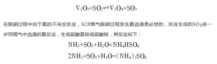 由于(yu)煙氣中(zhong)存(cun)在SO2等氣體,催化(hua)劑中(zhong)的(de)活性成分釩(fan)盡管是選擇催化(hua)降解(jie)NOx的(de),但也會(hui)對SO2的(de)氧化(hua)起到(dao)一定的(de)催化(hua)作用,SO2的(de)氧化(hua)率(lv)隨(sui)活性組分V2O5含量的(de)增加(jia)而(er)上升,其反應式如下(xia):