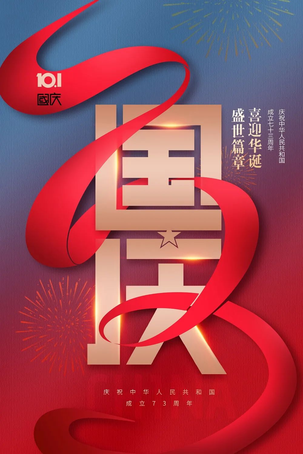 花團錦繡(xiu)擁(yong)金秋,萬(wan)里(li)河山迎國慶;張燈結彩慶豐(feng)收,龍飛獅舞鬧歡騰;禮炮繽(bin)紛展盛世,載歌(ge)載舞享和(he)諧。各族兒女共祝福,祖(zu)國繁(fan)榮(rong)富又(you)強,國泰民安(an)再輝煌。