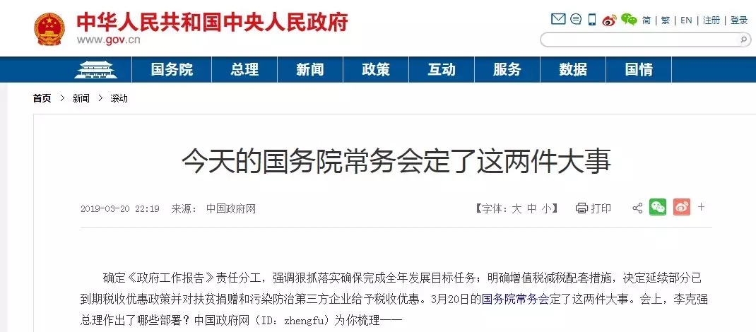 確(que)定《政府工作(zuo)報告》責任(ren)(ren)分(fen)工,強調狠(hen)抓落實確(que)保完成全年發展目標任(ren)(ren)務;明確(que)增值稅減稅配套措(cuo)施,決定延(yan)續部分(fen)已到期稅收優惠政策并(bing)對扶貧捐贈(zeng)和污染防治第三方企業給予(yu)稅收優惠。3月20日的國務院常務會定了(le)這兩件大事。會上,李克強總理作(zuo)出了(le)哪些部署?中(zhong)國政府網(ID:zhengfu)為(wei)你梳理──