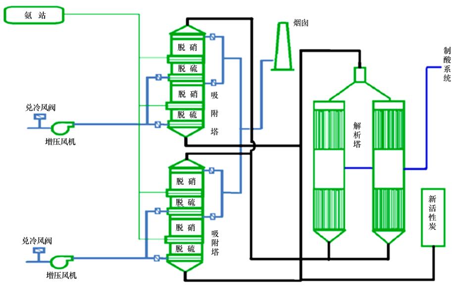 在河(he)鋼邯(han)鋼逆(ni)流(liu)式CSCR系(xi)統(tong)(tong)中(zhong),煙(yan)氣(qi)自下而上(shang)、活(huo)性(xing)炭(tan)自上(shang)而下,兩者逆(ni)流(liu)接觸(chu),活(huo)性(xing)炭(tan)連續地從吸附塔底(di)部排出,輸(shu)送到解析塔進行(xing)解析,解析后的活(huo)性(xing)炭(tan)再進入系(xi)統(tong)(tong)循(xun)環使用(工藝流(liu)程(cheng)見圖(tu)1)。