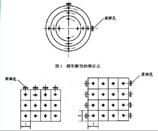 ③對圓(yuan)形煙道,采樣孔應設在(zai)包括(kuo)各(ge)測(ce)點在(zai)內的相互垂直的直徑線上(如(ru)下圖(tu)所示(shi))。對(dui)矩形(xing)或方形(xing)煙(yan)道,采樣孔應設在(zai)包括(kuo)各(ge)測(ce)點在(zai)內的延(yan)長線上(如(ru)下圖(tu)所示(shi))。