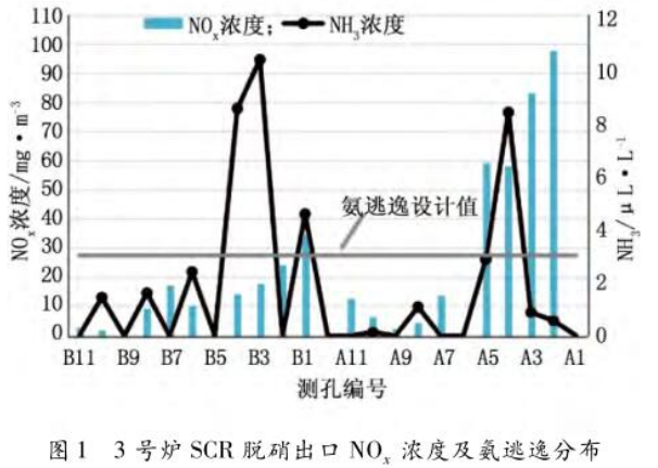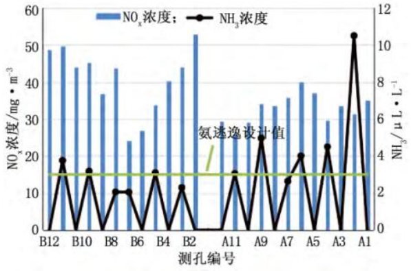 圖1 3號爐(lu)SCR脫硝出口NOx濃度及氨逃逸(yi)分布