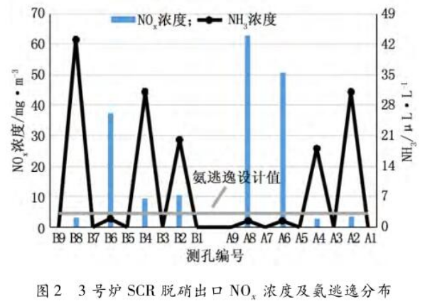 圖(tu)2 3號(hao)爐SCR脫(tuo)硝(xiao)出口NOx濃度及氨逃逸分布