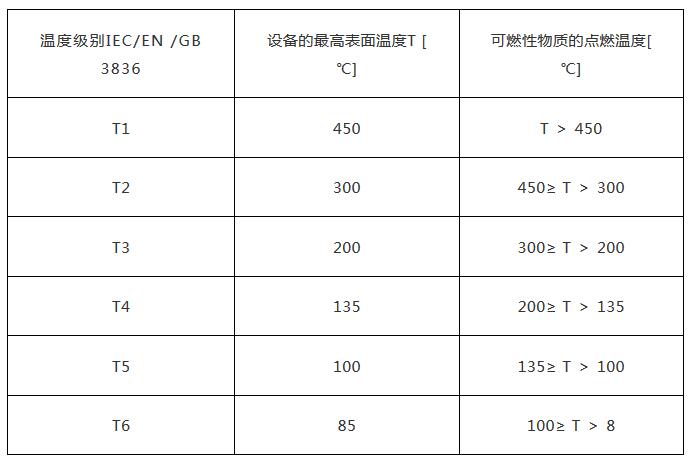 電氣設(she)備(bei)(bei)按其最高(gao)表(biao)(biao)面溫度(du)分(fen)為(wei) T1 ~ T6 組,使得對應(ying)的 T1 ~ T6 組的電氣設(she)備(bei)(bei)的最高(gao)表(biao)(biao)面溫度(du)不能超(chao)過對應(ying)的溫度(du)組別(bie)(bie)的允(yun)許值。溫度(du)組別(bie)(bie)、設(she)備(bei)(bei)表(biao)(biao)面溫度(du)和(he)可燃(ran)性氣體或(huo)蒸汽的引燃(ran)溫度(du)之間的關系如下表(biao)(biao)所示: