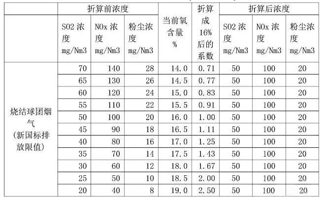 筆者給大家(jia)列出不(bu)同氧(yang)含(han)量下所對(dui)應的(de)(de)折算(suan)系(xi)統,然后(hou)給大家(jia)舉幾個(ge)形象的(de)(de)例子進(jin)行說明。以表1為例,假如(ru)目前燒結(jie)球(qiu)團的(de)(de)排放濃(nong)(nong)度(du)剛好不(bu)超過國(guo)標(biao)的(de)(de)規定值,則(ze)一(yi)旦根據氧(yang)含(han)量進(jin)行折算(suan)后(hou),是否(fou)還達標(biao)就取決(jue)于當(dang)前燒結(jie)球(qiu)團排放口的(de)(de)氧(yang)氣濃(nong)(nong)度(du)了,當(dang)前氧(yang)含(han)量越(yue)超過16%,則(ze)折算(suan)后(hou)的(de)(de)濃(nong)(nong)度(du)越(yue)高,即排放不(bu)達標(biao)情況(kuang)越(yue)嚴重(zhong),因此需要進(jin)行污染物加(jia)大治理的(de)(de)程(cheng)度(du)越(yue)需要強(qiang)化。反之(zhi),如(ru)果當(dang)前的(de)(de)氧(yang)濃(nong)(nong)度(du)較低,在(zai)16%以下,則(ze)反而多出了安全余量。