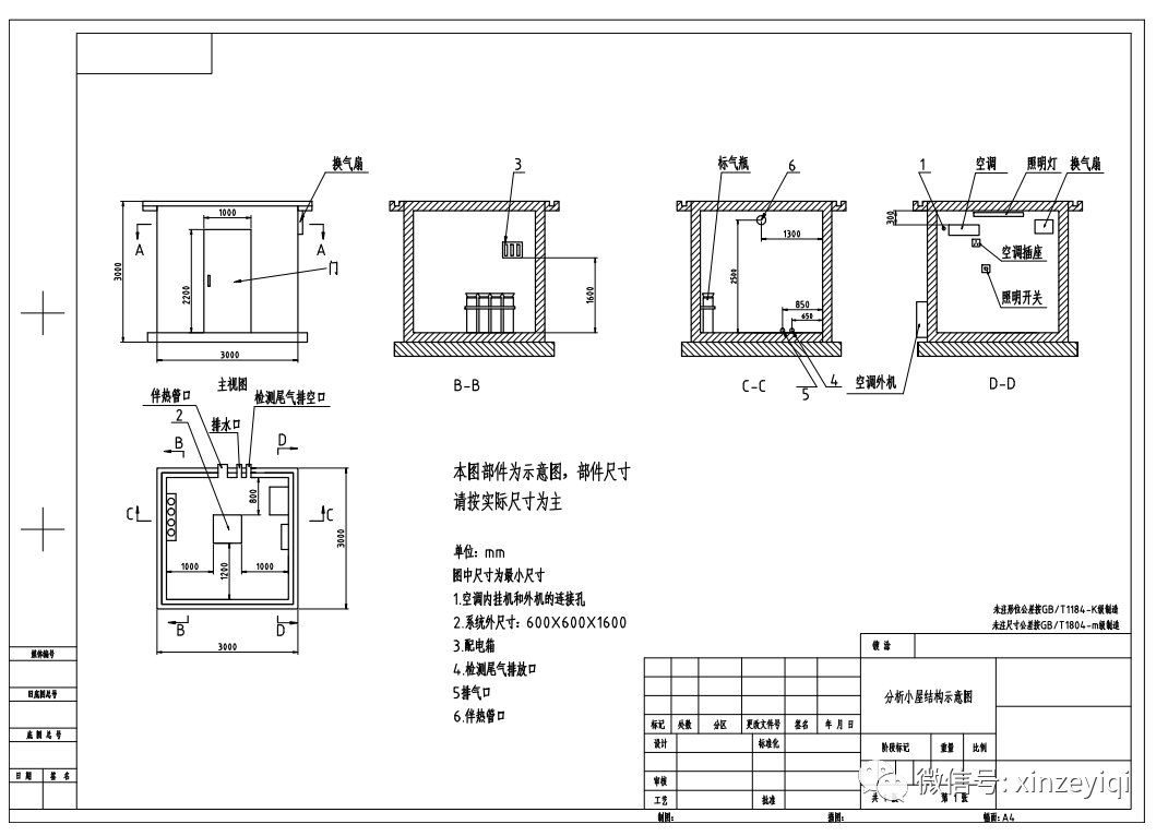 l 開(kai)(kai)孔(kong):在監測房內放置機柜背(bei)面墻壁(必要時側墻也可以,依據(ju)現場走線方(fang)便(bian)),距(ju)離地面高度的2.5m處,為(wei)(wei)樣氣(qi)管(guan)路(lu)及電纜管(guan)路(lu)開(kai)(kai)孔(kong),開(kai)(kai)孔(kong)尺寸為(wei)(wei)Φ90mm圓孔(kong),開(kai)(kai)孔(kong)數量1個;在機柜背(bei)面墻壁接(jie)近地面底部(bu)上開(kai)(kai)孔(kong),開(kai)(kai)孔(kong)尺寸為(wei)(wei)ф40mm,開(kai)(kai)孔(kong)數量1個,作為(wei)(wei)廢氣(qi)廢水排放口;站房內應安裝排氣扇,應預留安裝排氣扇孔位,具體開孔尺寸依據所購買排氣扇尺寸;安裝空調開孔尺寸為Φ90mm圓(yuan)孔;