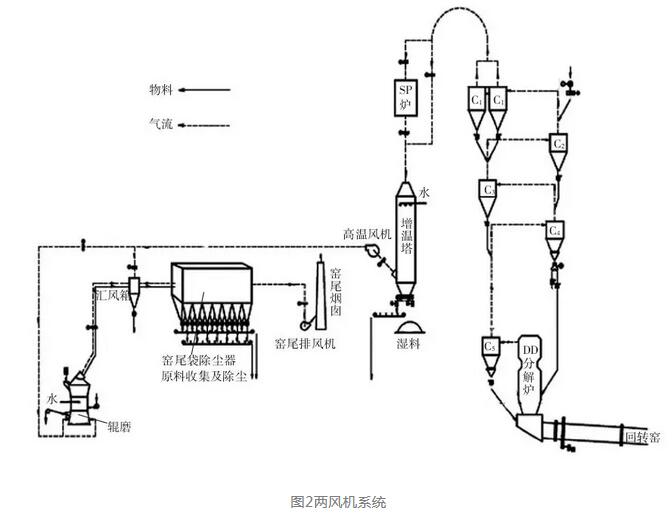 現有(you)干法(fa)水(shui)泥熟料生產(chan)線窯尾系(xi)統工(gong)(gong)藝(yi)主要有(you)兩種,即三風機(ji)系(xi)統和兩風機(ji)系(xi)統。圖1為輥磨系(xi)統組成的窯尾三風機(ji)系(xi)統典(dian)型工(gong)(gong)藝(yi),圖2為兩風機(ji)系(xi)統工(gong)(gong)藝(yi)。