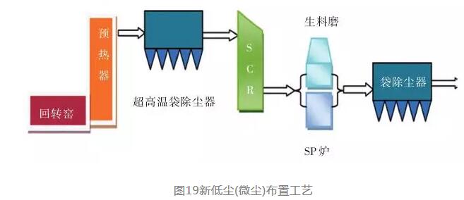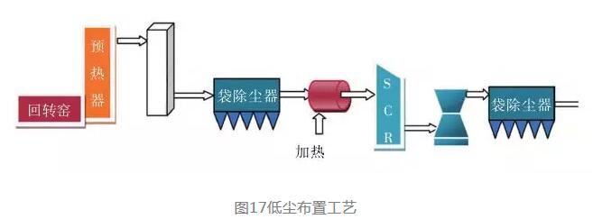 圖17為(wei)傳統(tong)的(de)低(di)塵(chen)布置工(gong)藝,采(cai)用(yong)傳統(tong)的(de)高溫(wen)(wen)袋(dai)除塵(chen)器可以保證進(jin)入(ru)SCR反(fan)應器的(de)廢氣含塵(chen)量極低(di),這樣粉塵(chen)對SCR催(cui)化劑的(de)影響小。但(dan)由于傳統(tong)濾(lv)袋(dai)的(de)耐溫(wen)(wen)限制(zhi),通(tong)常(chang)需(xu)要采(cai)用(yong)六級(ji)預(yu)熱(re)器,或優先通(tong)過SP余熱(re)鍋(guo)爐降(jiang)溫(wen)(wen),或采(cai)用(yong)增濕塔將(jiang)預(yu)熱(re)器出口(kou)廢氣溫(wen)(wen)度(du)降(jiang)低(di)到≤280℃,并且不允許(xu)出現超溫(wen)(wen)事故。降(jiang)溫(wen)(wen)除塵(chen)后(hou),為(wei)了(le)滿(man)足氮氧(yang)化物(wu)最(zui)佳催(cui)化還(huan)原(yuan)反(fan)應溫(wen)(wen)度(du),需(xu)要對煙氣進(jin)行(xing)再加熱(re),這無(wu)疑會(hui)使工(gong)藝復雜且有能源消耗(hao)。如果研發出有效可靠的(de)低(di)溫(wen)(wen)催(cui)化劑,無(wu)需(xu)對氣體再加熱(re),則是一個理想的(de)選擇。