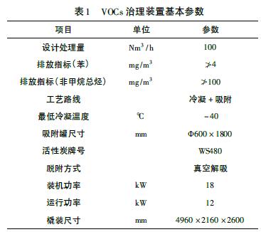 老罐區苯罐采(cai)用(yong)江蘇金門能源裝備有限公司設計、制造(zao)的JM - VRECS - CD/AD - 100 型VOCs 治理(li)裝置,冷凝+ 吸附集成工藝,裝置主(zhu)要參數如表1。
