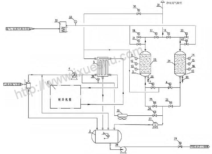 1 - 凝液(ye)(ye)收集(ji)罐(guan)(guan)(guan); 2 - 氣(qi)液(ye)(ye)分離罐(guan)(guan)(guan); 3 - 液(ye)(ye)位變(bian)(bian)(bian)(bian)送(song)(song)(song)(song)器(qi)(qi); 4 - 風機(ji); 5 - 冷箱; 6 - 制冷機(ji)組; 7 - 吸(xi)(xi)附(fu)(fu)罐(guan)(guan)(guan)進口(kou)(kou)(kou)閥(fa)(fa)(fa)(fa)A; 8 - 吸(xi)(xi)附(fu)(fu)罐(guan)(guan)(guan)進口(kou)(kou)(kou)閥(fa)(fa)(fa)(fa)B; 9 - 吸(xi)(xi)附(fu)(fu)罐(guan)(guan)(guan)A; 10 - 吸(xi)(xi)附(fu)(fu)罐(guan)(guan)(guan)B; 11 - 溫(wen)(wen)(wen)度(du)(du)(du)變(bian)(bian)(bian)(bian)送(song)(song)(song)(song)器(qi)(qi)A; 12 - 溫(wen)(wen)(wen)度(du)(du)(du)變(bian)(bian)(bian)(bian)送(song)(song)(song)(song)器(qi)(qi)B; 13 - 溫(wen)(wen)(wen)度(du)(du)(du)變(bian)(bian)(bian)(bian)送(song)(song)(song)(song)器(qi)(qi)C; 14 - 溫(wen)(wen)(wen)度(du)(du)(du)變(bian)(bian)(bian)(bian)送(song)(song)(song)(song)器(qi)(qi)D; 15 - 溫(wen)(wen)(wen)度(du)(du)(du)變(bian)(bian)(bian)(bian)送(song)(song)(song)(song)器(qi)(qi)E; 16 - 溫(wen)(wen)(wen)度(du)(du)(du)變(bian)(bian)(bian)(bian)送(song)(song)(song)(song)器(qi)(qi)F; 17 - 吸(xi)(xi)附(fu)(fu)罐(guan)(guan)(guan)出口(kou)(kou)(kou)閥(fa)(fa)(fa)(fa)A; 18- 吸(xi)(xi)附(fu)(fu)罐(guan)(guan)(guan)出口(kou)(kou)(kou)閥(fa)(fa)(fa)(fa)B; 19 - 吸(xi)(xi)附(fu)(fu)罐(guan)(guan)(guan)破真(zhen)(zhen)空(kong)閥(fa)(fa)(fa)(fa)A; 20 - 吸(xi)(xi)附(fu)(fu)罐(guan)(guan)(guan)破真(zhen)(zhen)空(kong)閥(fa)(fa)(fa)(fa)B; 21 - 吹掃氣(qi)進口(kou)(kou)(kou)閥(fa)(fa)(fa)(fa)A; 22 - 吹掃氣(qi)進口(kou)(kou)(kou)閥(fa)(fa)(fa)(fa)B; 23 - 吸(xi)(xi)附(fu)(fu)劑(ji)床層A; 24 - 吸(xi)(xi)附(fu)(fu)劑(ji)床層B; 25 - 真(zhen)(zhen)空(kong)脫附(fu)(fu)閥(fa)(fa)(fa)(fa)A; 26 - 真(zhen)(zhen)空(kong)脫附(fu)(fu)閥(fa)(fa)(fa)(fa)B; 27 - 真(zhen)(zhen)空(kong)泵(beng); 28 - 回液(ye)(ye)泵(beng); 29 - 外輸液(ye)(ye)流量開關閥(fa)(fa)(fa)(fa); 30 - 緊急放空(kong)閥(fa)(fa)(fa)(fa); 31 - 排放筒(tong); 32 - 加熱器(qi)(qi); 33 - 熱氣(qi)體溫(wen)(wen)(wen)度(du)(du)(du)變(bian)(bian)(bian)(bian)送(song)(song)(song)(song)器(qi)(qi); 34 - 熱氣(qi)體脫附(fu)(fu)開關閥(fa)(fa)(fa)(fa); 35 - 冷卻器(qi)(qi)、36 - 冷卻溫(wen)(wen)(wen)度(du)(du)(du)變(bian)(bian)(bian)(bian)送(song)(song)(song)(song)器(qi)(qi)