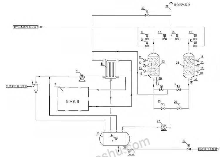 1 - 凝(ning)液(ye)收(shou)集罐(guan)(guan)(guan)(guan); 2 - 氣液(ye)分離罐(guan)(guan)(guan)(guan); 3 - 液(ye)位變送器; 4 - 風(feng)機(ji); 5 - 冷箱; 6 - 制(zhi)冷機(ji)組; 7 - 吸(xi)(xi)附(fu)罐(guan)(guan)(guan)(guan)進口閥(fa)(fa)A; 8 - 吸(xi)(xi)附(fu)罐(guan)(guan)(guan)(guan)進口閥(fa)(fa)B; 9 - 吸(xi)(xi)附(fu)罐(guan)(guan)(guan)(guan)A; 10 - 吸(xi)(xi)附(fu)罐(guan)(guan)(guan)(guan)B; 11 - 溫(wen)度(du)變送器A; 12 - 溫(wen)度(du)變送器B; 13 - 溫(wen)度(du)變送器C; 14 - 溫(wen)度(du)變送器D; 15 - 溫(wen)度(du)變送器E; 16 - 溫(wen)度(du)變送器F; 17 - 吸(xi)(xi)附(fu)罐(guan)(guan)(guan)(guan)出口閥(fa)(fa)A; 18- 吸(xi)(xi)附(fu)罐(guan)(guan)(guan)(guan)出口閥(fa)(fa)B; 19 - 吸(xi)(xi)附(fu)罐(guan)(guan)(guan)(guan)破(po)真(zhen)(zhen)空(kong)閥(fa)(fa)A; 20 - 吸(xi)(xi)附(fu)罐(guan)(guan)(guan)(guan)破(po)真(zhen)(zhen)空(kong)閥(fa)(fa)B; 21 - 吹(chui)掃(sao)氣進口閥(fa)(fa)A; 22 - 吹(chui)掃(sao)氣進口閥(fa)(fa)B; 23 - 吸(xi)(xi)附(fu)劑床(chuang)層A; 24 - 吸(xi)(xi)附(fu)劑床(chuang)層B; 25 - 真(zhen)(zhen)空(kong)脫附(fu)閥(fa)(fa)A; 26 - 真(zhen)(zhen)空(kong)脫附(fu)閥(fa)(fa)B; 27 - 真(zhen)(zhen)空(kong)泵; 28 - 回液(ye)泵; 29 - 外輸液(ye)流量開關閥(fa)(fa);30 - 緊急放(fang)空(kong)閥(fa)(fa); 31 - 排放(fang)筒
