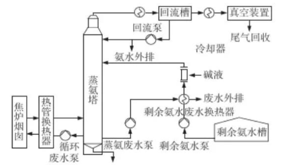 以焦爐(lu)煙道廢氣為(wei)熱(re)(re)源的(de)負壓蒸(zheng)(zheng)氨(an)(an)工藝(yi)流(liu)程(cheng):剩(sheng)余氨(an)(an)水(shui)經(jing)(jing)換熱(re)(re)器(qi)(qi)換熱(re)(re)后送入蒸(zheng)(zheng)氨(an)(an)塔進(jin)(jin)(jin)行蒸(zheng)(zheng)餾,蒸(zheng)(zheng)氨(an)(an)塔頂氨(an)(an)汽經(jing)(jing)分縮器(qi)(qi)、冷卻(que)器(qi)(qi)冷卻(que)后,冷卻(que)氨(an)(an)水(shui)進(jin)(jin)(jin)入回(hui)流(liu)槽(cao),槽(cao)頂不凝汽在真空裝(zhuang)(zhuang)置吸(xi)力作用下(xia),經(jing)(jing)冷卻(que)器(qi)(qi)冷卻(que)后進(jin)(jin)(jin)入吸(xi)煤(mei)氣管道中;槽(cao)底氨(an)(an)水(shui)用回(hui)流(liu)泵(beng)抽出,一(yi)部分送蒸(zheng)(zheng)氨(an)(an)塔頂回(hui)流(liu),一(yi)部分作為(wei)產品氨(an)(an)水(shui)外送。蒸(zheng)(zheng)氨(an)(an)塔底蒸(zheng)(zheng)氨(an)(an)廢水(shui)進(jin)(jin)(jin)入煙氣熱(re)(re)管換熱(re)(re)器(qi)(qi)循環加熱(re)(re)后返(fan)回(hui)蒸(zheng)(zheng)氨(an)(an)塔內(nei);另(ling)一(yi)部分蒸(zheng)(zheng)氨(an)(an)廢水(shui)與原料剩(sheng)余氨(an)(an)水(shui)換熱(re)(re)降(jiang)溫(wen)后送廢水(shui)處理裝(zhuang)(zhuang)置。其工藝(yi)流(liu)程(cheng)圖如圖5所示。