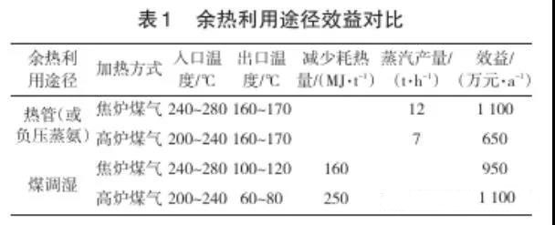 由于焦爐加(jia)熱(re)用煤氣種類的不同(tong),焦爐煙(yan)道(dao)廢(fei)氣余熱(re)利用的溫度差別很大(da),以年產(chan)120萬t焦炭的焦爐煙(yan)道(dao)廢(fei)氣利用熱(re)管技(ji)術生產(chan)蒸(zheng)汽(或(huo)負(fu)壓蒸(zheng)氨)和煤調濕技(ji)術進行對比(bi),對比(bi)結(jie)果見表1。